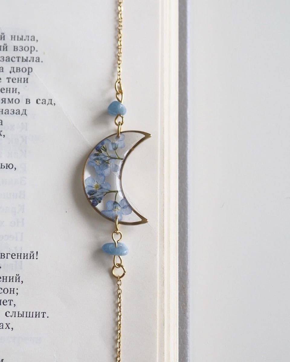 A moon-shaped bracelet cradles delicate forget-me-not flowers, preserved as symbols of memory, loyalty, and love that never fades. Beside them rests a serene blue crystal, chosen for its calming presence and celestial glow—echoing the quiet pull of the night sky. Together, the moon and florals represent promises made in silence and connections that endure across time, making this bracelet a gentle reminder to remember, and to be remembered.