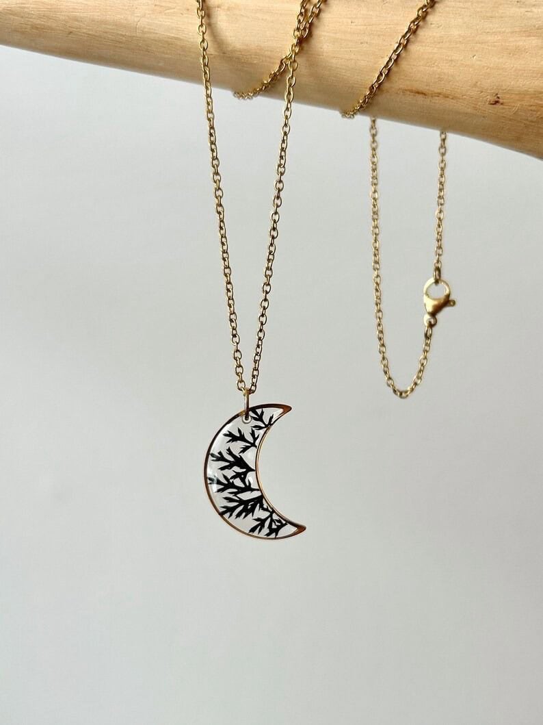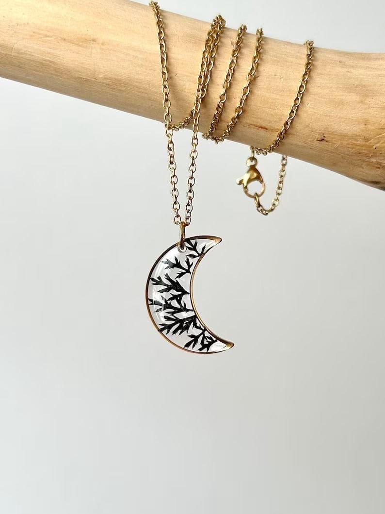 Shaped like a crescent moon, this necklace holds dark, dried thorns and a single leaf form—raw, restrained, and unapologetically real. It represents protection born from vulnerability, the way growth often comes wrapped in sharp edges. The moon symbolizes cycles and quiet power, while the thorns speak of boundaries, survival, and strength earned through experience. This piece is a reminder that even in darkness, you are guarded, growing, and whole.